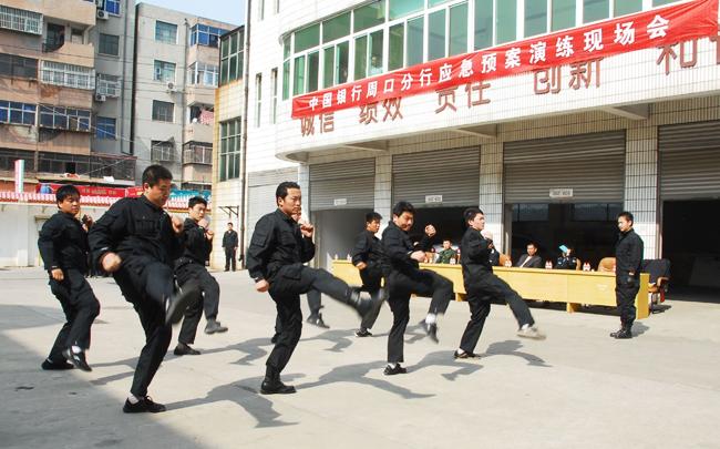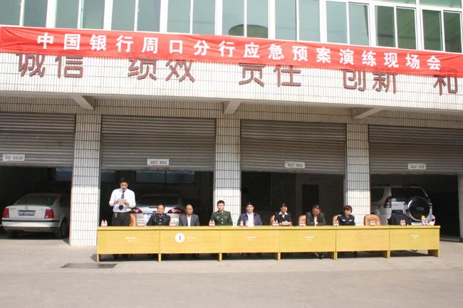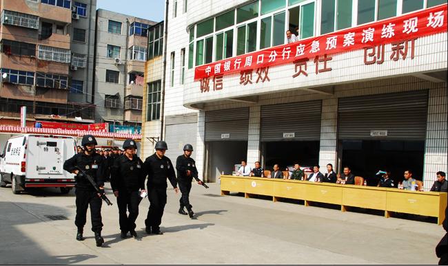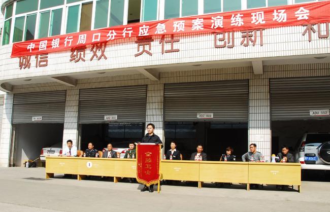 4月14日下午,中国银行周口分行院内,周口市保安服务公司与中国银行周口分行联合举行守押工作应急预案演练。中国银行周口分行任梅萍书记、监保科李团国科长、周口市公安局内保大队大队长王欣、周口市保安服务公司党总支书记郑明山、公司领导任萍、郭伟、蒋子华和周口市银监局、周口市消防支队等有关领导一同出席并观摩了现场应急预案演练。
