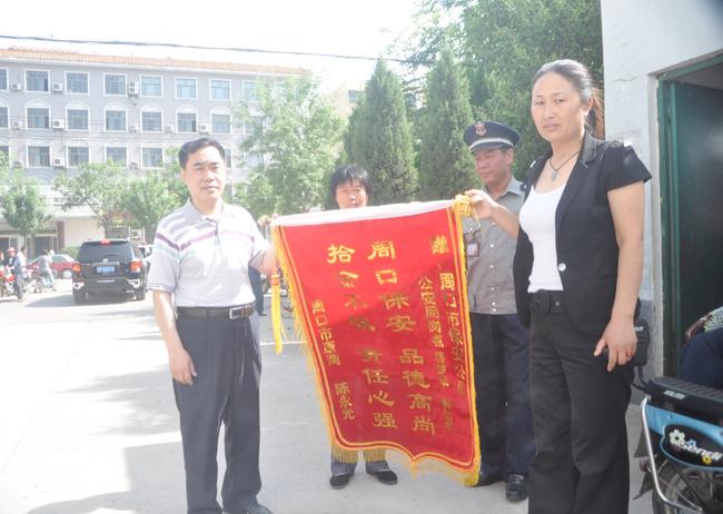 5月16日上午,周口保安公司院内鞭炮齐鸣,来自我市康湾的陈先生及家属向保安公司送来锦旗致谢。